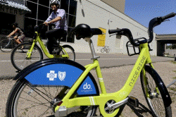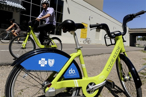 The program's light-green bike kiosks are concentrated downtown, at the University of Minnesota's campus and near dining hot spots. Bikes will be available from April to November. "As more people are riding downtown, more people will feel comfortable doing it," Dossett said. Both Minneapolis and Denver saw the possibilities when bike-sharing programs were used at the 2008 Republican and Democratic conventions they hosted, with 1,000 bikes at each location. In eight days that summer, the program logged 7,523 bike rides and 41,724 miles. Portland, Ore., is watching the Minnesota and Denver programs before deciding whether to launch its own. "Bike-sharing is a fairly expensive investment, and there are not any cities with our level of bicycling that have introduced bike-sharing that have seen a measurable increase in the percentage of people biking," said Steve Hoyt-McBeth, project manager in the Portland Bureau of Transportation. Marilyn Lundberg headed a failed program in St. Paul 15 years ago. She believes Nice Ride Minnesota has a good shot at succeeding because riders are responsible for the bikes. "That's a lot more sophisticated than we could ever have gotten," Lundberg said. ___ Online: