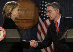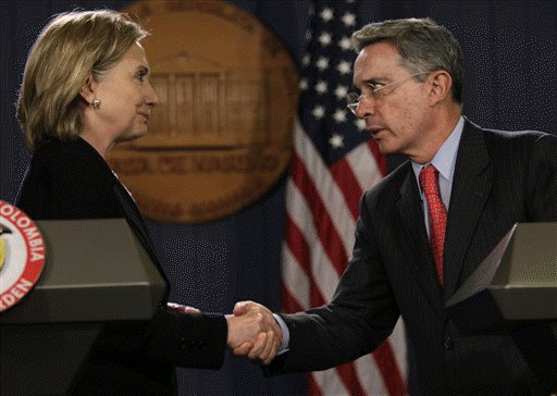 "The security threats have not completely been eliminated and therefore the United States will continue to support the Colombian military, the Colombian people and their government in their ongoing struggle," Clinton said. "There is no resting until the job is done." She raised the issue of Colombia's human rights record, cited by foes of congressional approval of a free trade agreement with Bogota. She said she had discussed "the ongoing need for vigilance and commitment" on rights with Uribe, who said his country was making progress. During her current Latin American tour, which has included stops in Peru and Ecuador, Clinton sought to overcome suspicions of U.S. intentions in several Latin American capitals. During the Bush administration, several countries in the region began a tilt to the left, led by Chavez, and some leaders complained they were being ignored by Washington. "I cannot change that and neither can President Obama," she said Tuesday in Quito, the capital of Ecuador. "Sometimes, we in America are accused of not paying enough attention to our history. But the obverse can also be true. Sometimes people are captives of their history." "So let us resolve to meet in the present, to think about what we can do to understand one another better, to be more transparent to one another, to have candid, open exchanges of different points of view," Clinton said.