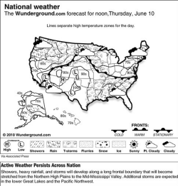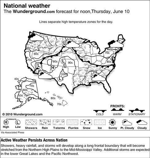 [June 10, 2010]  (AP)  Scattered showers and thunderstorms were forecast to continue moving through the eastern U.S. on Thursday while another low pressure system moved into the Plains.