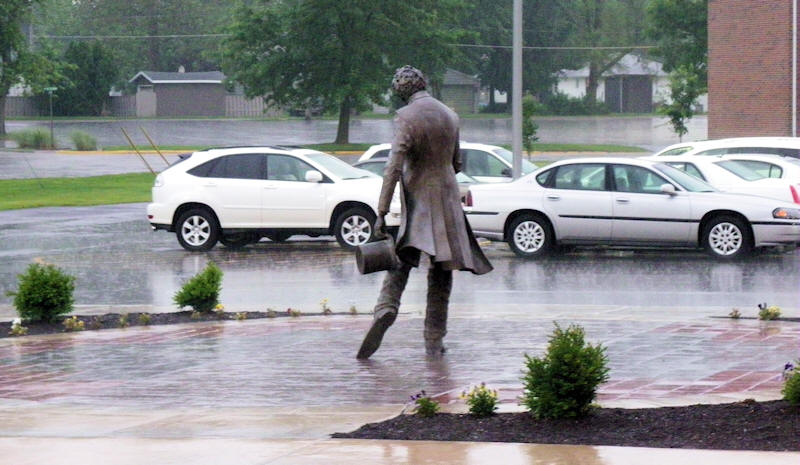 Hurry, Abe. The new statue of Abraham Lincoln outside the Lincoln Center at Lincoln College looks like he is in a hurry to get out of Tuesday's rainstorm. We can only surmise that the statue probably wishes the sculptor had decided to place the hat on his head. Picture by Mike Fak (Click on picture for larger image.) |