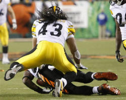 The three players had a friendly exchange one day after their hard-hitting game. On the Bengals' final, futile drive, Owens caught a pass and was immediately leveled by Polamalu.