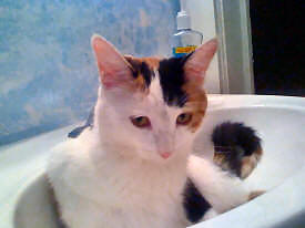 She is mostly white with black and tan markings and tan on the tip of her tail.