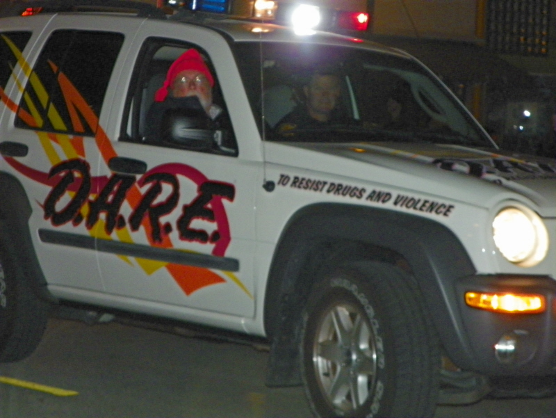 Santa hat, rides the route in the D.A.R.E. vehicle.