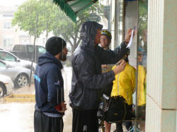 the two had ducked under an awning to get out of a pouring rain.