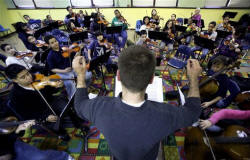 -- gangs or things that he shouldn't be into," she says. That's why, even after they moved to a neighborhood 16 miles away, on the city's South Side, she continued to keep him enrolled at Lafayette, which is just northwest of downtown Chicago. Each morning, they get up at 6 so Jaylen can get to school on time and his mom to her job at a bank near the school. "Jaylen hates to be late, hates to be absent," his mother says, laughing. And that is absolutely fine with her. ___ Jaylen and about 100 others were up early on a recent chilly Saturday morning, gathering in the park for which Humboldt Park was named. It is a park often associated with drug deals and other crime. This morning, however, parents, teachers and students were marching around its perimeter. They were joined by representatives of corporate and nonprofit organizations that have donated to the school's orchestra program. At another school event, dubbed "Stuck for Strings," students bought strands of duct tape for $1 apiece to literally tape those volunteers to a wall. Both events were early signs that principal Shrode might just be right -- that this community and other supporters would rally around her cause. So far, the fundraisers have brought in more than $6,000, while a neighborhood nonprofit called Reason to Give is well over halfway to its goal of raising another $5,000 for the music program, Shrode said. That will cover the cuts made in the Merit budget -- but Shrode eventually would like to raise enough to cover the entire cost to the school, little by little, to make sure the program is always there. As Weible likes to say, "We're doing it by hook or by crook. But we're getting there." Leaders at the Merit School of Music have been so impressed that they invited students from the Lafayette orchestra to play at their spring fundraiser, an event attended by wealthy donors. Leuhrsen, from the NAMM Foundation, also praised the school's efforts. "This is a relentlessness and belief in children that needs to be celebrated and acknowledged," she says. She does worry that many schools in low-income neighborhoods might be missing out on federal funding for arts education through such programs as Title I because they don't know they can get it. Lafayette does get Title I money, which it can use for the music program. But Shrode says the needs at the school are so great for so many things that, if they can raise the orchestra money independently, they could use the federal money for, say, another reading intervention specialist or maybe even full-day kindergarten, some day. For the young musicians at Lafayette, all that matters is that there is enough money so they can keep playing, as they did in May at a Merit festival at Chicago's downtown Orchestra Hall. The morning of the concert, students rushed onto yellow school buses with their instruments, eager for their chance to play on the big stage. "When the lights are shining, they do their best," Weible excitedly told a bus driver. Some of the youngest students, on their first visit to Orchestra Hall, stared up at the ornate ceiling as they waited to play. Others fidgeted. One accidentally plucked a string, prompting a "shh" from an older student. Nidalis and Jaylen were among those who played with an advanced group, which included students from other schools with Merit programs. When they finished their three songs, all of them proudly took a bow. "We rock!" Nidalis shouted, as they walked backstage and out of the auditorium. She removed her shoes and skipped giddily through the hallways, the sound of applause and whistles still echoing behind her. ___ Online: Lafayette school: Merit School of Music: NAMM Foundation: