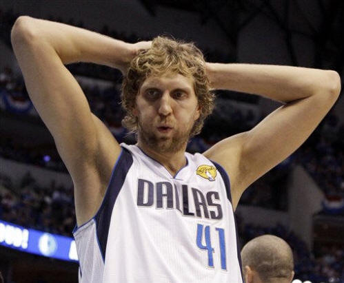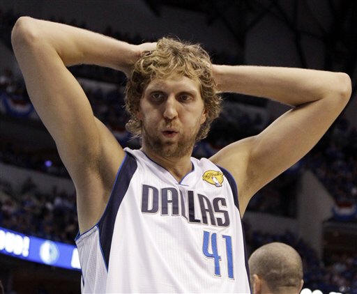 the NBA finals basketball game against the Miami Heat on Tuesday in Dallas. Despite having the flu, Nowitzki led the Mavs