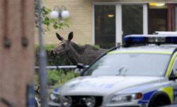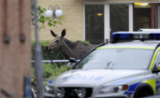 Police say aside from the moose, who was scratched by the broken window, no one was injured in Thursday's surprise visit at the Brunnsgarden retirement home in the small town of Alingsas.