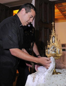 After a press conference on the steps of the church, Magana carried the delicate gold reliquary inside the church under the watchful eyes of a police officer. He led a prayer of gratitude for about three dozen people in English and Spanish.