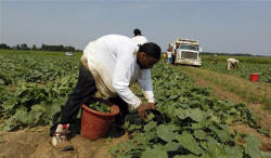 Temperatures hovered in the low 90s with heavy humidity Thursday, but taking off a shirt to relieve the heat invited a blistering sunburn. Tiny gnats flew into workers' eyes and ears. One experienced Latino worker carried a machete that he used to dispatch a rattlesnake found in the fields. By law, each worker must earn minimum wage, or $7.25 an hour. But there's an incentive system. Harvesters get a green ticket worth 50 cents every time they dump a bucket of cucumbers. If they collect more than 15 tickets an hour, they can beat minimum wage. The Latino workers moved furiously Thursday for the extra pay. Jose Ranye, 37, bragged he's the best picker in Americus, the largest community near the farm. His whirling hands filled one bucket in 25 seconds. He said he dumped about 200 buckets of cucumbers before lunch, meaning he earned roughly $20 an hour. He expected to double his tickets before the end of the day. None of the probationers could keep pace. Pay records showed the best filled only 134 buckets a day, and some as little as 20. They lingered at the water cooler behind the truck, sat on overturned red buckets for smoke breaks and stopped working to take cell phone calls. They also griped that the Latinos received more tickets per bucket than they did, an accusation that appeared unfounded. Robert Dawson, 24, was on his fourth day of fieldwork. On probation for commercial burglary, he said the governor's idea was a good one and long overdue. He said farmers were at least partially to blame if they're experiencing a labor shortage because they hired illegal immigrants. "I feel like they should have gone and hired us first before they even hired them," he said in the morning. "You pay us right and we'll get out here and work. If you don't want to pay us nothing and we're out here in this hot heat, 100-and-some degree weather, it ain't gonna last." By the afternoon, Dawson had sweated through his shirts, and his steps had become labored. His arms and back were sore, but he continued to work after other probationers had quit or were sitting under the shade of the truck. In a quiet sign of mercy, a Latino supervisor helped Dawson fill his bucket and walked it to the truck.