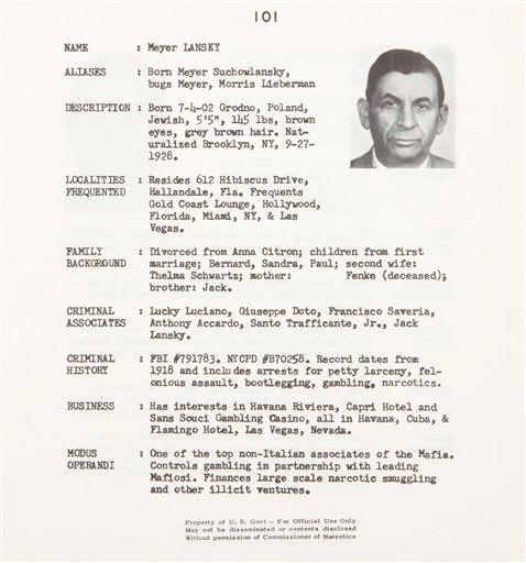 Lansky was portrayed in "The Godfather II" movie by the character Hyman Roth who whispers to Michael Corleone: "We're bigger than U.S. Steel." The Bureau of Narcotics files lists Lucky Luciano among his criminal associates, his favorite hangouts as Hollywood, Miami and Las Vegas and his business interests as hotels and casinos in Cuba and Nevada. Titillating facts on Lucky Luciano include a description of him as "one of the highest ranking Mafia both in Italy & the US. From Italy he participates in directing of American rackets & regularly receives his share of the profits through Mafia couriers." His friends include some of the most powerful and influential Mafia bosses: the "prime minister" of the underworld Frank Costello and crime family boss Joe Bonanno. On the bottom of each entry are the words: "Property of U.S. Govt -- for official use only. Not to be disseminated or contents disclosed without permission of Commissioner of Narcotics." Geiger said the cloth cover binder is not dated, except for two pages. One is from 1959, the other from 1962, indicating the files were most likely compiled before the McClellan hearings (there's no mention of the testimony in the book) and after the police raid on the mob conference in upstate New York in 1957. There was evidence that Robert Kennedy used a copy to select "who he was going to target in the McClellan Hearings; 1,500 people testified before that committee and the Mafia file was used as a source for the hearings," Geiger said. "It started with the Bureau of Narcotics and then kicked upstairs to the attorney general's office." Genovese crime family soldier Joseph Valachi testified for the government, famously coining the phrase La Cosa Nostra. It was the first time that the government and the public heard of the underworld as an integrated network of criminals with a hierarchical structure. ___ Online: http://www.bonhams.com/