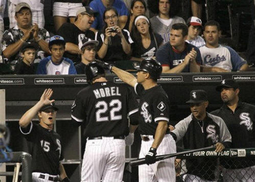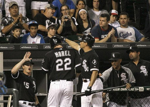 Sox's Brent Morel (22) is greeted at the dugout by Gordon Beckham,