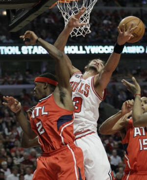 rebound against Atlanta Hawks' Joe Johnson during the second quarter