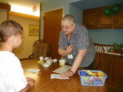 Gail King stamps a young man's passport on his last stop of the day.