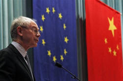 Van Rompuy said he was heartened by China's latest five-year plan for development that envisions shifting the economy away from exports and investment and toward increased reliance on domestic demand, eventually reducing and possibly eliminating its trade surplus and other imbalances. Van Rompuy stressed the central importance of human rights in the EU's foreign policy and called on China to honor international rights covenants it has signed. "This work is among the core values the European Union is build on. It is of deep concern for European citizens and it is reflected in our diplomacy across the world," he said. The EU was among foreign governments and rights groups that expressed concern for Ai's detention that began April 3 when he was stopped at a Beijing airport while attempting to board a flight to Hong Kong. That made the avant-garde artist the highest profile figure so far to be swept up in the recent crackdown on dissent, one of the biggest in years, that has seen hundreds of bloggers, academics, lawyers and activists questioned, detained, arrested or simply disappeared. Van Rompuy did not mention the crackdown directly, but indicated China's global image could suffer from its actions. "China's contribution to implementing the universal principles of human rights and rule of law will be important elements in shaping its global public reputation," he said.