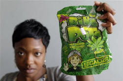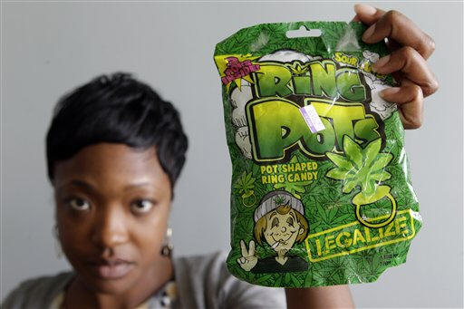 Charmaine Rosendary, 36, of Buffalo shook her head when she saw a picture of the package. "That's not right. It's just promoting marijuana," she said while buying produce Friday at a Buffalo market. She said she wouldn't allow her five teenagers, ages 15-19, to have it. "I would not buy it or give them money to buy it," she said. "It looks like weed." It's not the first legal product to come under fire. In 2008, the Hershey Co. stopped making Ice Breakers Pacs in response to criticism that the mints looked too much like illegal street drugs. Police in Philadelphia complained that the packets, nickel-sized dissolvable pouches with a powdered sweetener inside, closely resembled tiny heat-sealed bags used to sell powdered street drugs. Candy cigarettes and fruity or energy drink-infused alcoholic beverages have been criticized for targeting young people. And in 1997, the Federal Trade Commission said the iconic Joe Camel cigarette ads and packaging violated federal law because they appealed to kids under 18. The tobacco company, R.J. Reynolds, eventually shelved the caricature. A spokesman for the Office of National Drug Control Policy said advocates for legalization who claim marijuana is benign are not supported by science. "Trivializing drug use is a threat to public health because it erodes perceptions of harm among young people," said Rafael Lemaitre. Kalan said his company carries several products with the marijuana leaf and "legalize" message to accommodate growing demand in the movement to legalize marijuana. "We don't advocate for a political position. We just look at what the marketplace wants and respond to it," the wholesaler said. "It's just candy... It's sour apple flavor, it doesn't claim to be pot in disguise or anything like that."
