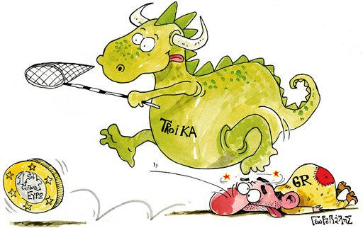 'Every time I come to Greece and I watch the news on TV, I am not surprised why drama and comedy were born in Greece.'" Michael Kountouris, an editorial cartoonist for 25 years who has won international awards, said he valued the example set by the early 20th century Soviet poet Vladimir Mayakovsky, who viewed art as a means to shape, rather than reflect, the world. Kountouris prefers the power of image alone, letting the viewer, he said in an email, "find answers to questions that probably you haven't posed yet." One drawing shows a forlorn man sitting on top of an ancient column submerged in water. Nearby, a polar bear floats on a small island of ice. In another picture, torch-bearing men in Ku Klux Klan-style hoods and robes stand at night around a flaming euro symbol, a stand-in for a burning cross. "Until now, Greek cartoons had been dealing with the internal affairs of the country, matters that could even be unknown to the European reader. Lately, the subject we are working on has become of global concern," Kountouris wrote. "The crisis in Greece is turning into an institutional one, a political one, a lack of trust, of reliable information by the media, and last but not least, a lack of humanity." Kountouris said he was dismissed from his job at the newspaper Eleftheros Typos this month. The newspaper declined to comment.