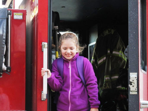R achel Morrow, a student at Carroll Catholic School, was the first-grade winner of the Lincoln Fire Department poster contest for Fire Protection Month. Rachel received a ride to school in the fire department's ladder truck on Friday. Her brother Luke kept her company on the way to school. Rachel and her mother baked cupcakes for the firemen on Thursday night to thank them for the ride. Rachel's parents are Greg and Peggy Morrow. To see Rachel's winning poster, click on her picture.Picture by Marla Blair (Click on picture for larger image.) |