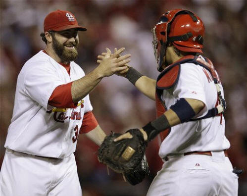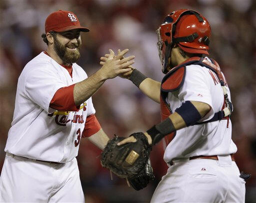 St. Louis Cardinals' Jason Motte (30) celebrates with