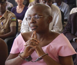 Victoire Ingabire appeared in court in the Rwandan capital of Kigali Friday in a prisoner's uniform, handcuffs and with a shaved head. She is accused of genocide ideology, revisionism and backing terrorist groups. She has not yet entered a plea, but her four co-accused