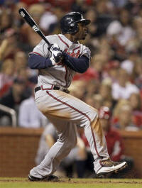 Michael Bourn matched his career best with four hits and an RBI for the Braves, who also got RBI doubles from Brian McCann and Freddie Freeman in the first inning. Chipper Jones was robbed his first two trips by Berkman's outstanding running catch at the track in right in the first inning and second baseman Skip Schumaker's leaping grab of a liner in the third. Jones singled in the seventh.