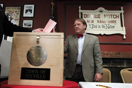 [January 10, 2012]  DIXVILLE NOTCH, N.H. (AP) -- Voters in the tiny New Hampshire village famed for casting the first ballots in the nation's first presidential primary found themselves in a tie Tuesday between Republicans Mitt Romney and Jon Huntsman.