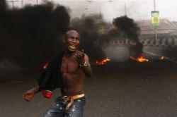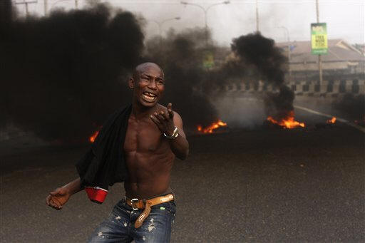 It is unclear how long the strike will last. The unions have said described it as indefinite, saying they'll stop only if the government restores the fuel subsidies. Jonathan insists that the subsidies be removed to save the country about $8 billion a year, money he says will go toward badly needed road and public projects. Those protesting Tuesday morning on Ikoyi Island said they no longer believe in the government, shouting: "They will kill us and we will kill them!" A convoy of police escorting a member of the country's elite arrived, with officers loudly loading their Kalashnikov rifles in an attempt to drive the protesters away. Officers put out part of the flaming blockade with an extinguisher, but drove off, leaving the protesters behind. Another convoy of unarmed officers arrived. They pleaded with protesters for calm but instead they threw stones as the officers put out the flames.