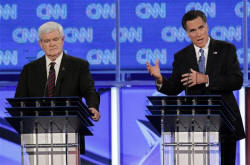 Gingrich raised questions about Romney's wealth and his investments. "I don't know of any American president who's had a Swiss bank account," Gingrich said. Romney replied that his investments were in a blind trust over which he had no control. "There's nothing wrong with that," declared Romney, who has estimated his wealth at as much as $250 million. Earlier Thursday, it was disclosed that Romney and his wife, Ann Romney, failed to list an unknown amount of investment income from a variety of sources including a Swiss bank account on financial disclosure forms filed last year. His campaign said it was working to correct the omissions. Gingrich also failed to report income from his 2010 tax return on his financial disclosure. The former Georgia congressman will amend his disclosure to show $252,500 in salary from one of his businesses, spokesman R.C. Hammond said. Debating in a state with a large and influential Jewish population, Romney and Gingrich vied to stress their support for Israel rather than criticize one another. And all four men were quick to name prominent officials of Hispanic descent who deserved consideration for the Cabinet. Gingrich trumped the other three, saying, "I've actually thought of Marco Rubio in a slightly more dignified and central role," an evident reference to the vice presidential spot on the ticket. Immigration was a recurring theme. Gingrich said Romney was misleading when he ran an ad accusing the former House speaker of once referring to Spanish as "the language of the ghetto." Gingrich claimed he was referring to a multitude of languages, not just Spanish. Romney initially said, "I doubt it's mine," but moderator Wolf Blitzer read it aloud and pointed out that Romney, at the ad's conclusion, says he approved the message. As for immigration policy, it was difficult to discern their differences. Both men said they want to clamp down in illegal immigration, create programs to make sure jobs go only to legal immigrants and deport some of the 11 million men and women in the country unlawfully. Gingrich has never said how many illegal residents he believes should be deported, preferring to say that the United States is not going to begin rounding up grandmothers and grandfathers who have lived in the United States for years. Romney agreed that was the case -- and Gingrich said that marked a switch in position. "Our problem is not 11 million grandmothers," Romney said. "Our problem is 11 million people getting jobs that many Americans, legal immigrants would like to have." Romney and Gingrich also exchanged jabs over investments in Fannie Mae and Freddie Mac, two mortgage giants that played a role in the national foreclosure crisis that has hit Florida particularly hard. Gingrich said Romney was making money from investments in funds that were "foreclosing on Floridians." Romney quickly noted that Gingrich, too, was invested in mutual funds with Fannie Mae and Freddie Mac. He then added that the former House speaker "was a spokesman" for the two. That was a reference to a contract that one of Gingrich's businesses had for consulting services. The firm was paid $300,000 in 2006.