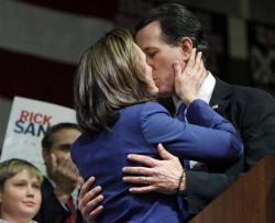 Santorum celebrated in Steubenville, an eastern Ohio town just a 90-minute drive from his own Pennsylvania hometown. Earlier in the day, he delivered an in-person address to the American Israel Public Affairs Committee's annual conference in Washington. He immediately criticized Tuesday's offer by the U.S., European countries, Russia and China to resume talks with Iran on its suspected nuclear weapons program, calling it "another appeasement, another delay, another opportunity for them to go forward while we talk." Speaking Tuesday night with his 93-year-old mother at his side, Santorum largely set aside his aggressive social agenda and focused instead on his family's blue-collar roots. "Not too many presidential candidates come to Steubenville, Ohio, much less hold their victory party in Steubenville, Ohio," he said. "This is our roots."