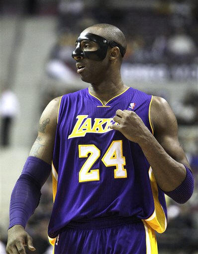 Bryant took the floor wearing a black-rimmed mask to protect the nose he broke in the All-Star game. As missed shots piled up in the first half, he switched to a clear mask that looked more similar to what he wore in a win over the Miami Heat on Sunday.