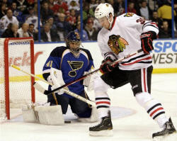 Halak got lucky on the Blackhawks' best chance in the first. Patrick Sharp's shot hit the left post and instead of banking off the goalie's backside and into the net the puck got trapped under Halak's body and eventually squirted out.
