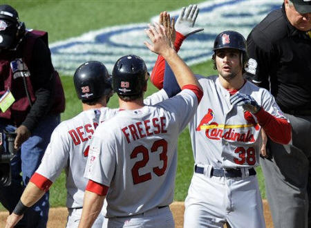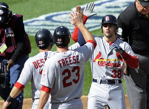 rookie Pete Kozma, right, high-fives teammates David Freese and Daniel Descalso