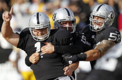 Raiders cornerback Pat Lee then forced a fumble downfield by Pittsburgh receiver Antonio Brown that Philip Wheeler recovered at the Oakland 36. Palmer then drove the Raiders down the field and they tied the game on a 32-yard field goal by Janikowski with 6:30 to play.