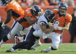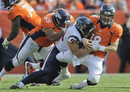 He never found much of a groove in the first three quarters and the Broncos were held to three field goals and a safety in falling behind by 20. There were no interceptions, but that's not to say Houston didn't have its way with the 36-year-old quarterback, who came into the game with 42 career touchdowns against the team he started beating when it was in its expansion season, back in 2002.