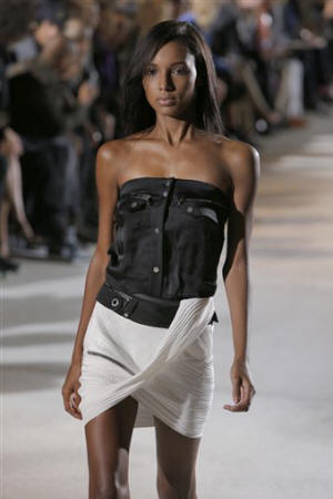 -- set off with creative spirals, polygons and geometric shapes. Lemoine gives freedom to the natural weight of wool -- producing some sumptuous effects, like one plunging gray and camel column dress. Lest we forget it's summer, it's all served up with a refreshing palette of sky blue, navy, pearl beige purple and white. Splashes of delicate, tightly knitted silk alongside breezy organza undergarments and the occasional peplum was a new addition this season. ANTHONY VACCARELLO Sticking to black and white is one sure way to stand out in spring collections, which are famed for their use of color. But at the moment, it's not as if Anthony Vaccarello needs the attention. His recent fashion headlines include a design stint at Collette as part of Vogue's Fashion Night Out. In this uber-sexy, color-free summer offering, the models' legs did the talking: Micro skirts with a tight, sweeped draping. There was a distinct feeling of previous seasons' Milan shows -- plunging necklines, draped tops with eyelets and loose shoulder-strong jackets. At times, the draping invoked a Grecian toga look.