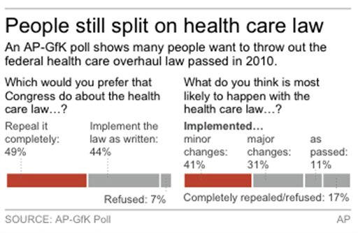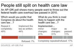 -- including possible delays in implementation -- also must be considered. For now, White House officials refuse to be drawn in on that question. Some parts of the law already are in effect; its big coverage expansion for the uninsured doesn't come until 2014. Public opinion about the law itself has barely budged since the summer of 2010, soon after it passed. At the time, 30 percent supported the law. It's now 32 percent. And 40 percent opposed the overhaul. That's now 36 percent. And misconceptions about the law that reigned two years ago continue to live on, including former Alaska Gov. Sarah Palin's widely debunked charge that it would create "death panels" to decide on care for the elderly and disabled. In 2010, 39 percent believed the law would set up committees to review individual medical records and decide who gets care paid for by the government. Forty-one percent currently hold that view, according to the poll. The poll asked people to say whether 18 different items were in the law or not and to rate how certain they were about their answers. Just 14 percent were right most of the time and sure of it. Still, knowledge about what the law actually does is growing. More people are aware of provisions that allow adult children to stay on their parents' coverage until age 26, impose insurance mandates on individuals and businesses, and protect those with pre-existing medical conditions. The poll was conducted Aug. 3-13 and involved interviews with 1,334 randomly chosen adults nationwide. It has a margin of sampling error of plus or minus 3.4 percentage points. The survey was conducted online by GfK using its KnowledgePanel sample, which first chose people for the study using randomly generated telephone numbers and home addresses. Once people were selected to participate, they were interviewed online. Participants without Internet access were provided it for free. ___ Online: