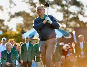 starter Jack Nicklaus hits his drive on the 1st hole