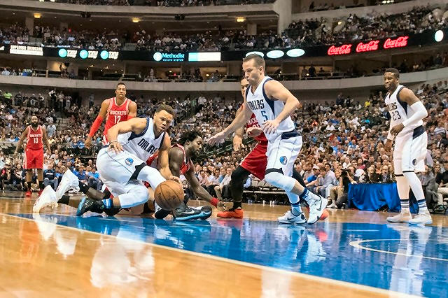 Mavericks and Houston Rockets fight for the loose ball during