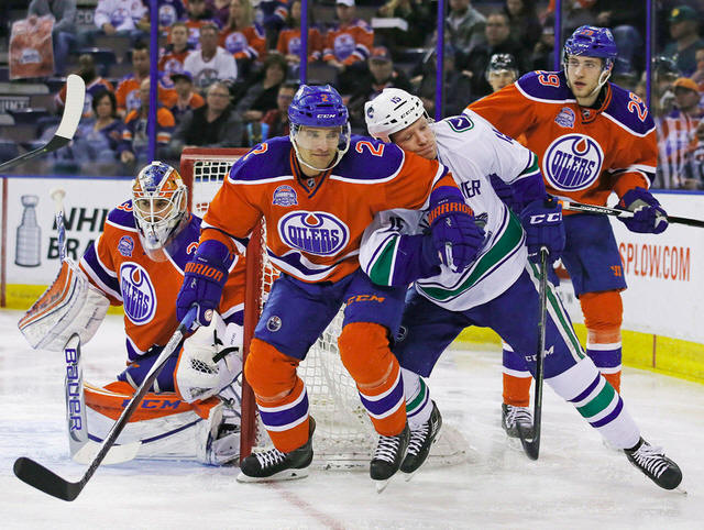 Vancouver Canucks forward Derek Dorsett (15) and Edmonton Oilers
