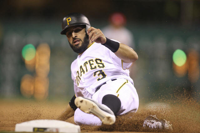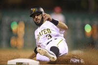 Pirates pinch hitter Sean Rodriguez (3) slides into third base