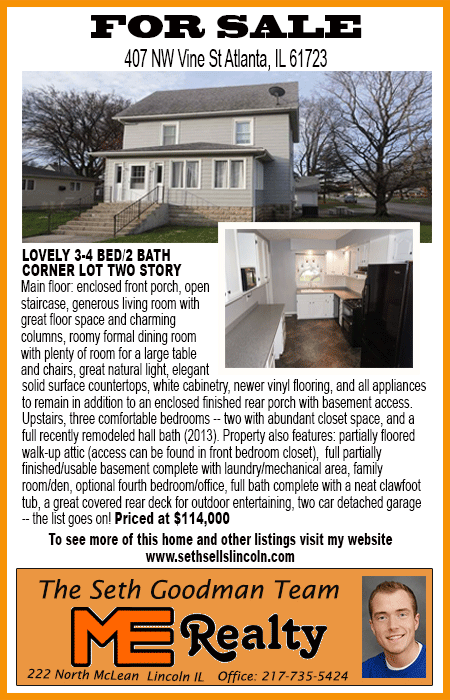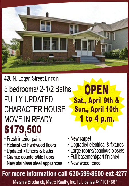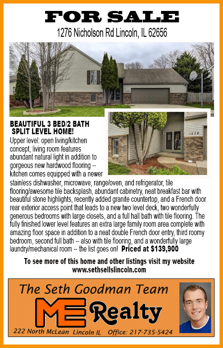 All real estate advertised in the Lincoln Daily News is subject to the Fair Housing Act for 1968 which makes it illegal to advertised "any preference, limitation, or discrimination based on race, color, religion, sex or national origin, or intention to make special preference, limitations, or discrimination."