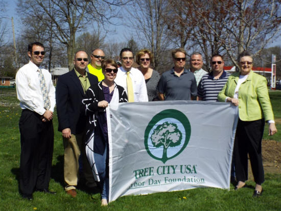 On Friday morning, officials from the city of Lincoln gathered in Postville Park to dedicate two new trees recently planted as part of the city's Tree City USA Program. The trees are replacing older, damaged trees, that had to be removed. Pictured holding the Tree City banner on the left is Michelle Bauer and on the right is Lincoln Mayor Marty Neitzel. Gathered behind the banner left to right are City Administrator Clay Johnson, Alderman Todd Mourning, Assistant Street Superintendent Russell Wright, City Treasurer Chuck Conzo, City Clerk Susan Gehlbach, Alderman Rick Hoefle, Street Superintendent Walt Landers and Alderman Tracy Welch.