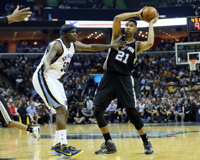 Spurs center Tim Duncan (21) passes as Memphis Grizzlies forward