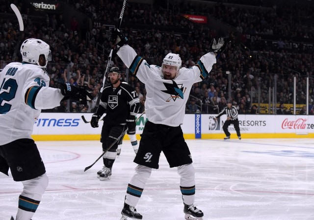 Sharks right wing Joonas Donskoi (27) celebrates with right wing