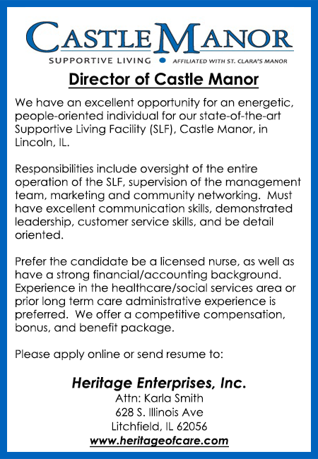 Lincoln YMCA is accepting applications through May 9th for a Sports/Aquatic Director. Must have Associates Degree, diverse experience with sports, and strong management skills. Forward resume to Lincoln YMCA, 604 Broadway Street, #1, Lincoln, IL or call 217-735-3915 for more information.