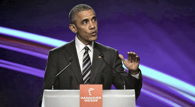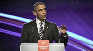With German Chancellor Angela Merkel sitting in the audience, Obama
