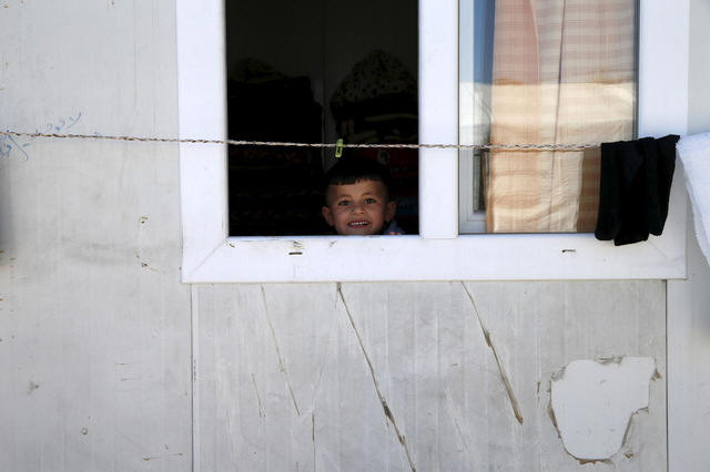 Yazidi boy Emad, 5, looks out of his family's home at a refugee