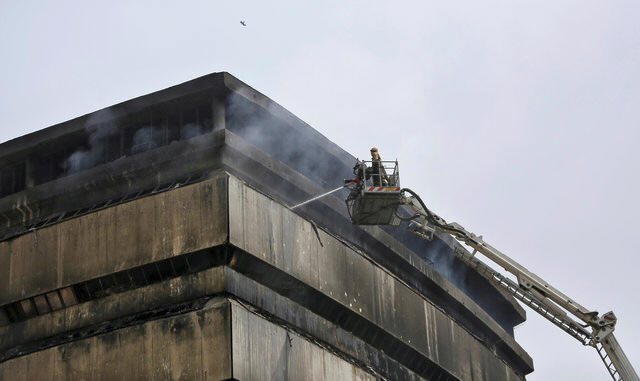 A firefighter works to extinguish fire in the building of