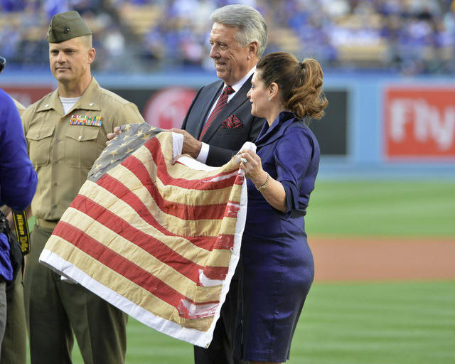 Former Dodger and now radio broadcaster Rick Monday threw out the
