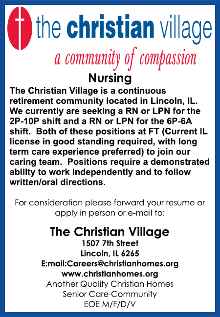 Lincoln YMCA is accepting applications through May 9th for a Sports/Aquatic Director. Must have Associates Degree, diverse experience with sports, and strong management skills. Forward resume to Lincoln YMCA, 604 Broadway Street, #1, Lincoln, IL or call 217-735-3915 for more information.