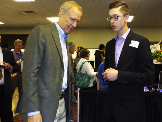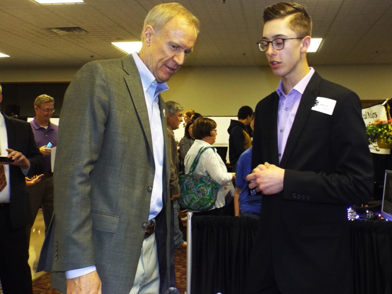 Illinois Governor Bruce Rauner visits with Eli Olson at the Wednesday evening Land of Lincoln CEO Tradeshow. Olson's business was Aedifex 3-D Printing. Rauner arrived at the tradeshow shortly after 5 p.m. going booth to booth and speaking with each of the young entrepreneurs.